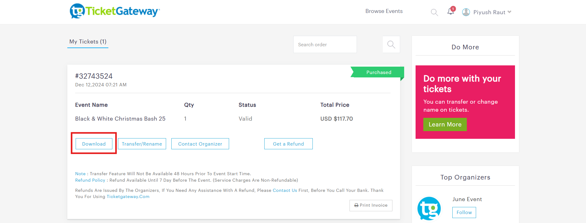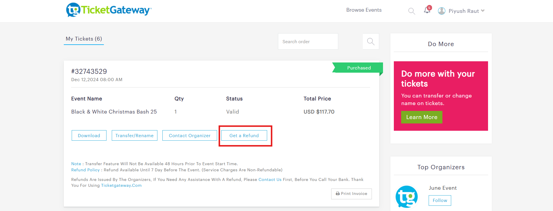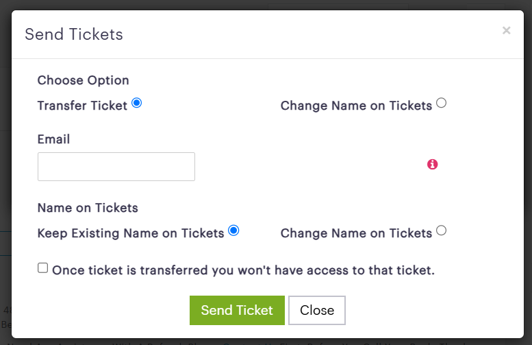 Note : Transfer feature will not be available 48 hours prior to event start time.