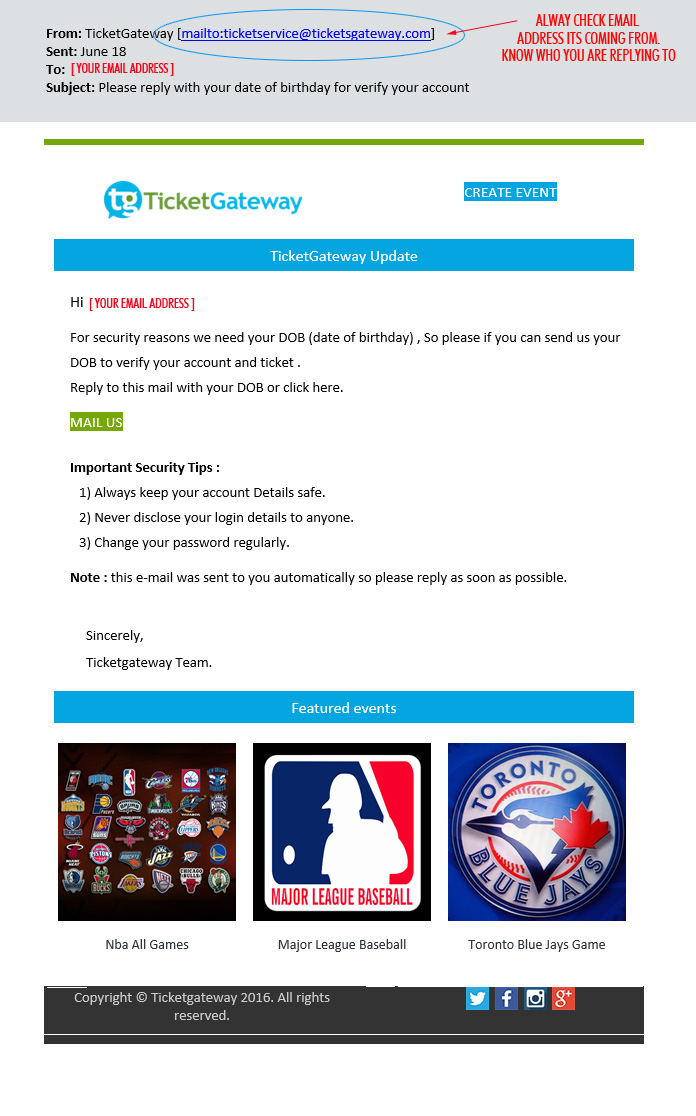 Phishing is an attempt to obtain your confidential information by impersonating a trusted source through email communication. Ticketgateway would like to inform you on what to do if you receive a phishing email.