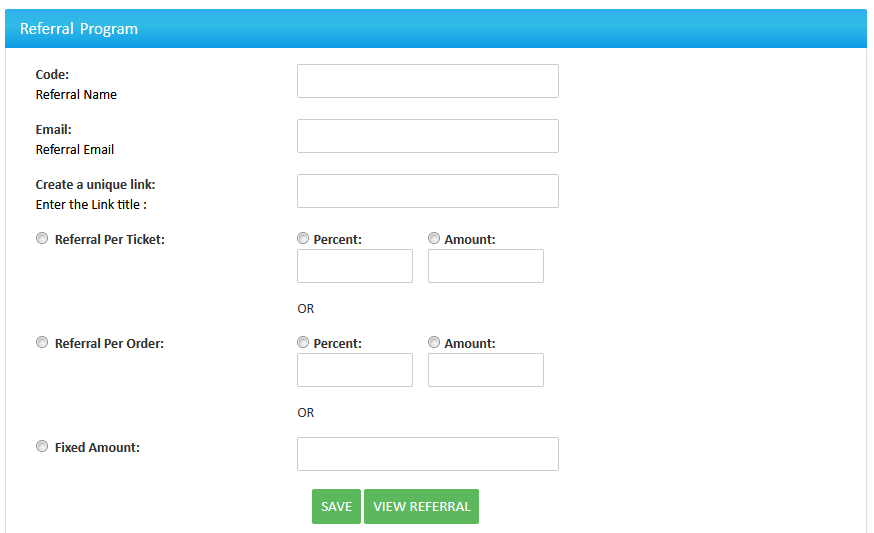 Enter the code, email, and unique short title of your affiliate program and enter the referral fee you will pay to an affiliate for each attendee they refer to your event, When you are done, click “Save”.